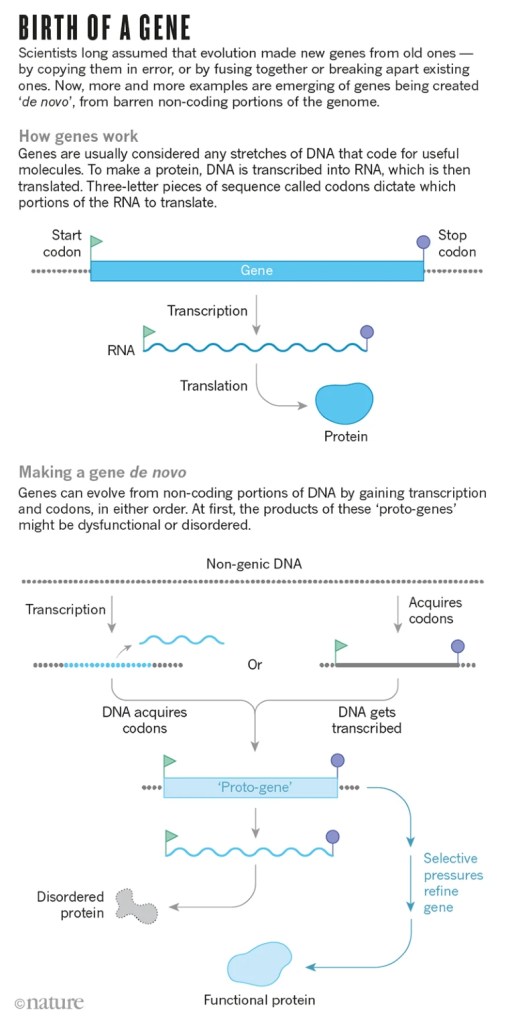 - Levy, Adam. “How Evolution Builds Genes from Scratch.” Nature News, Nature Publishing Group, 16 Oct. 2019, https://www.nature.com/articles/d41586-019-03061-x#:~:text=Each%20new%20gene%20must%20have,each%20with%20their%20own%20function.