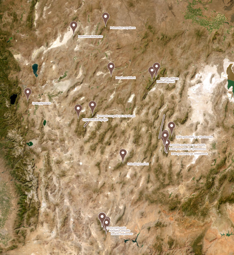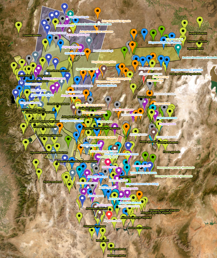 • Most species listed in Nevada Vascular Flora have specific range limits detailing their outermost points. Instead of trying to highlight every single point these species exist, I instead have opted to use single markers showing such range limits. You can filter by species so this should have a similar effect.